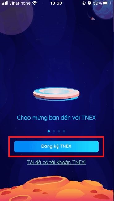 Bước 5: Ở giao diện ban đầu của App Tnex, nhấn vào nút Đăng Ký để mở tài khoản mới.