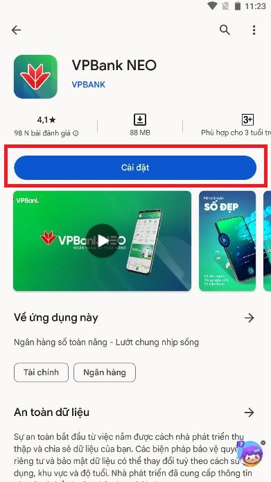 Bước 3: Trang tìm kiếm hiện ra, lựa chọn App VP Bank và nhấn vào nút Cài Đặt. App sẽ được tải về và cài đặt tự động.