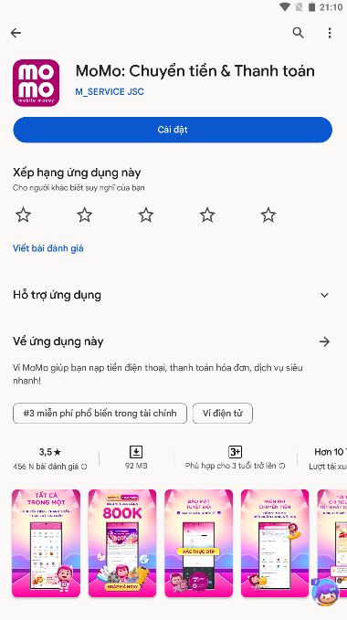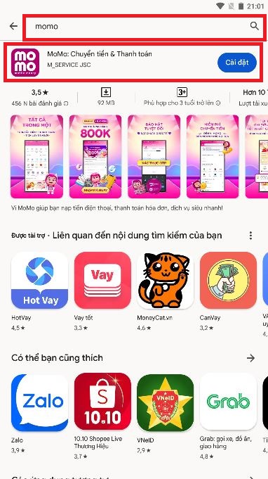 Bước 3: Trang tìm kiếm hiện ra, lựa chọn App Momo và nhấn vào nút Cài Đặt.