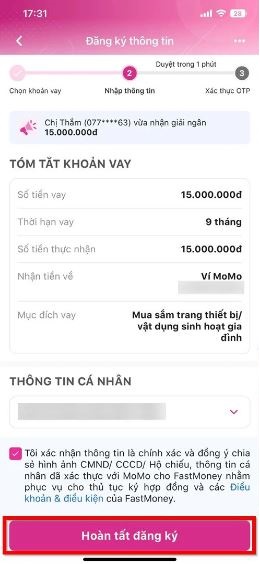 Bước 4: Sau khi khoản vay được xét duyệt thành công. Bạn sẽ nhận được một tin nhắn xác nhận giải ngân. Tiền giải ngân sẽ được cộng trực tiếp vào tài khoản gốc ở Momo.