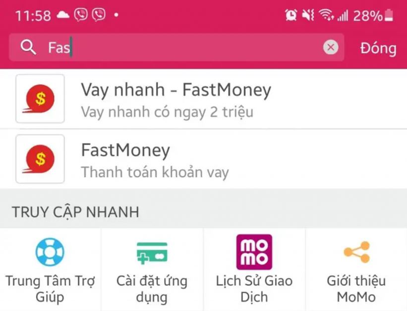 Bước 1: Mở App Momo lên, nhấn vào mục Tài Chính. Tại mục này sẽ có nhiều dịch vụ đăng ký vay tiền Online qua App. Lựa chọn dịch vụ vay tiền nhanh Fast Money để bắt đầu lên hồ sơ vay tiền.