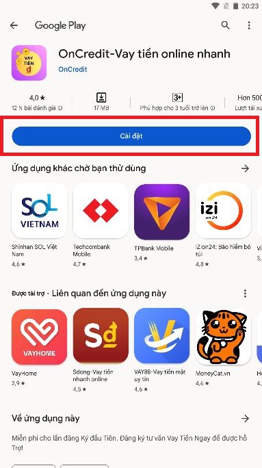 Bước 3: Ở trang tìm kiếm, lựa chọn App Oncredit và nhấn vào nút Cài Đặt.